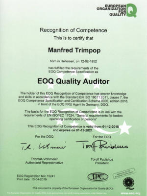 DIN EN ISO 50001, ISO TS 16949, VDA Bd. 6.1, DIN EN ISO 9001:2015, DIN EN ISO 14001, u.a.